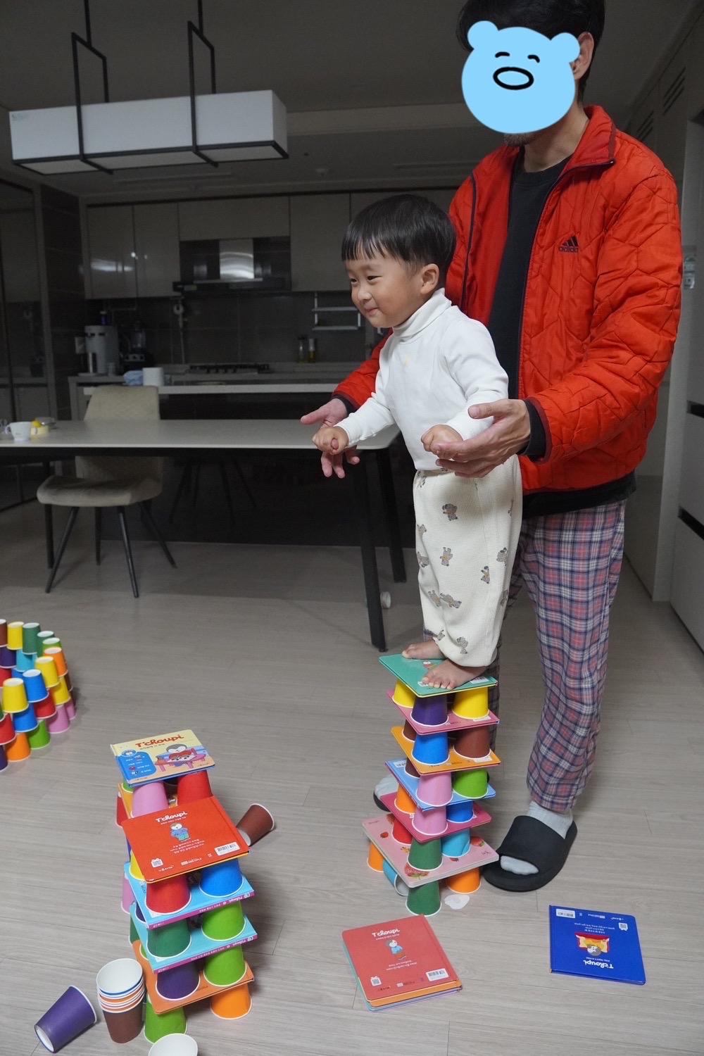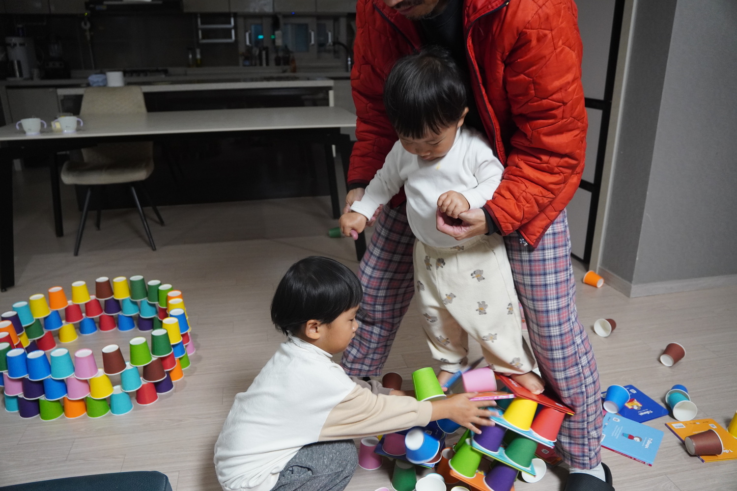 아이들이 컵으로 하는 놀이 중 이 놀이를 가장 좋아해서 웃음이 끊이질 않았고, 가장 오랜 시간 집중해서 놀이했습니다. 1층에서 성공한 뒤로 종이탑 높이는 점점 올라갔는데, 예상치 못하게 무너질 때마다 온 가족이 깔깔 웃었어요.