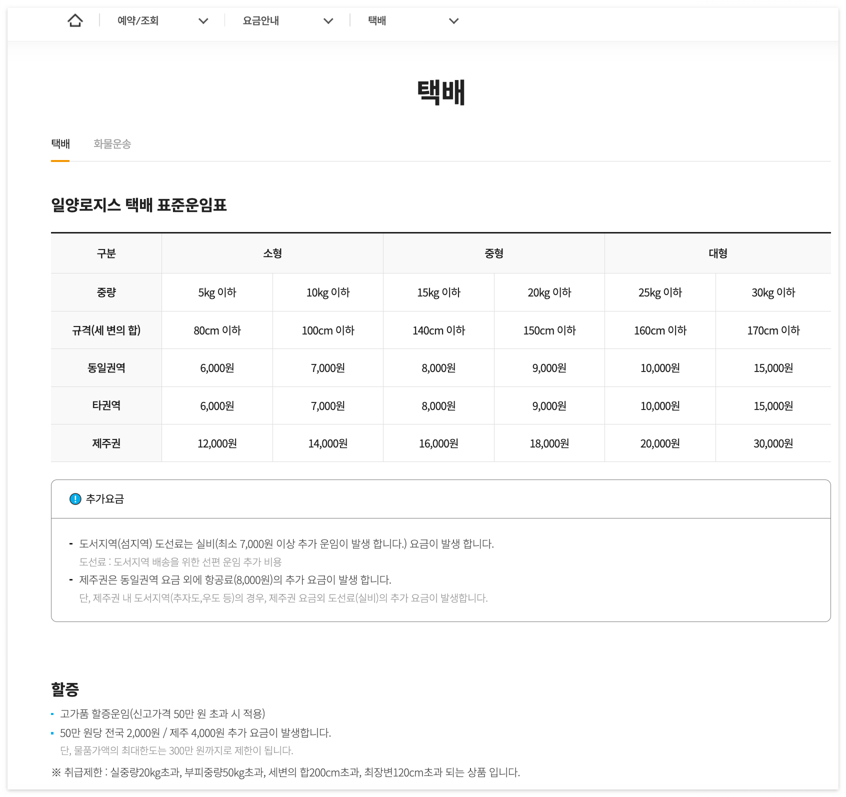 홈페이지에서 택배 표준운임표를 보고 정확한 운임을 미리 확인할 수 있습니다.