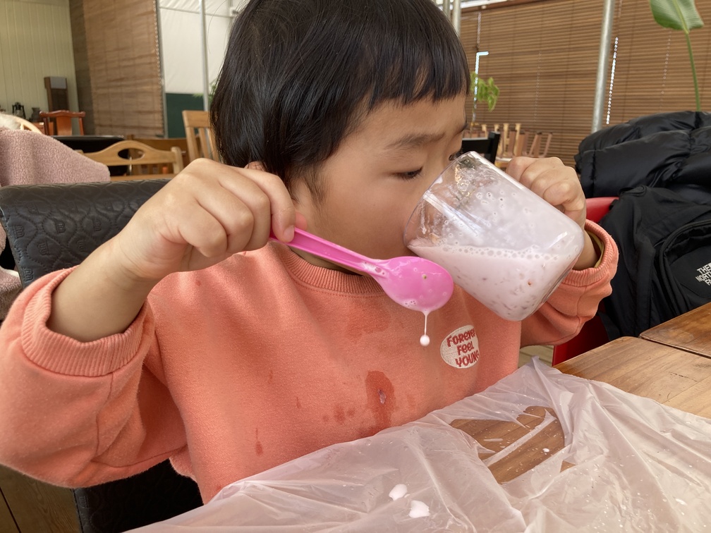딸기를 다 먹어가면 라떼 만들기 쟁반을 가져다 주세요.