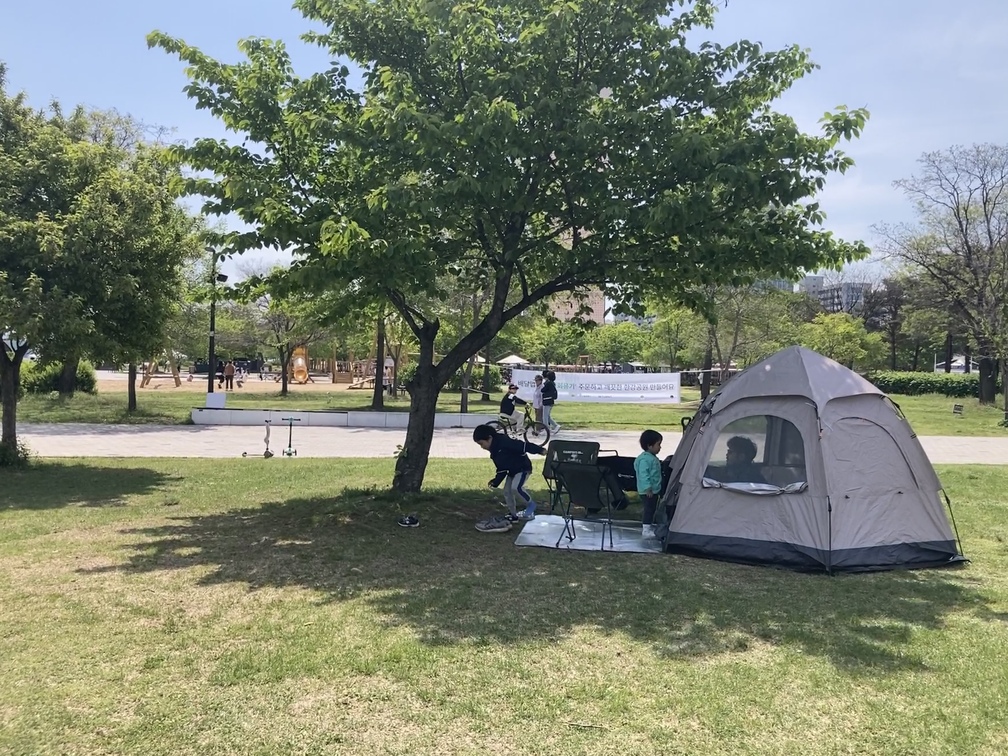 모래놀이터 주변 잔디에는 텐트를 설치할 수 없어요.