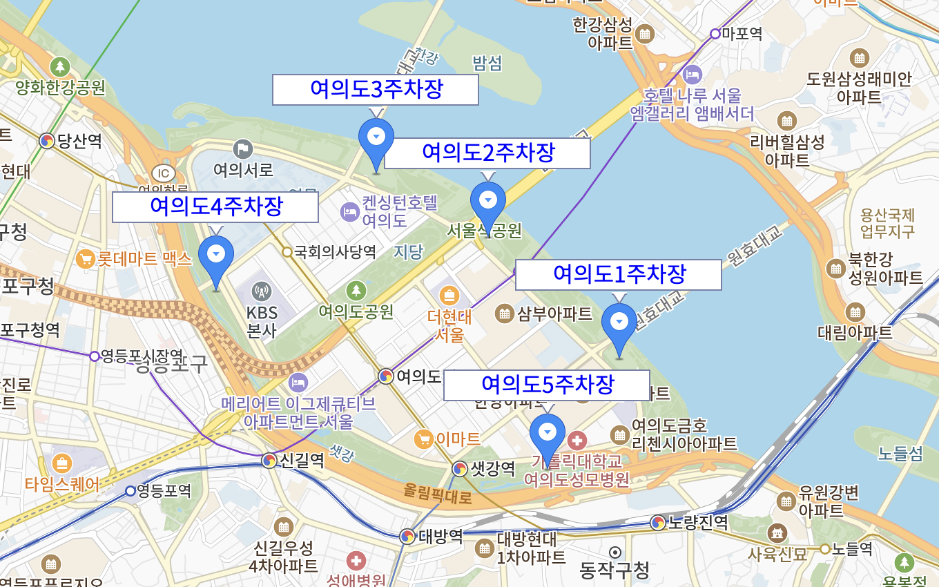 여의도 한강공원에는 1주차장부터 5주차장까지 있어요.